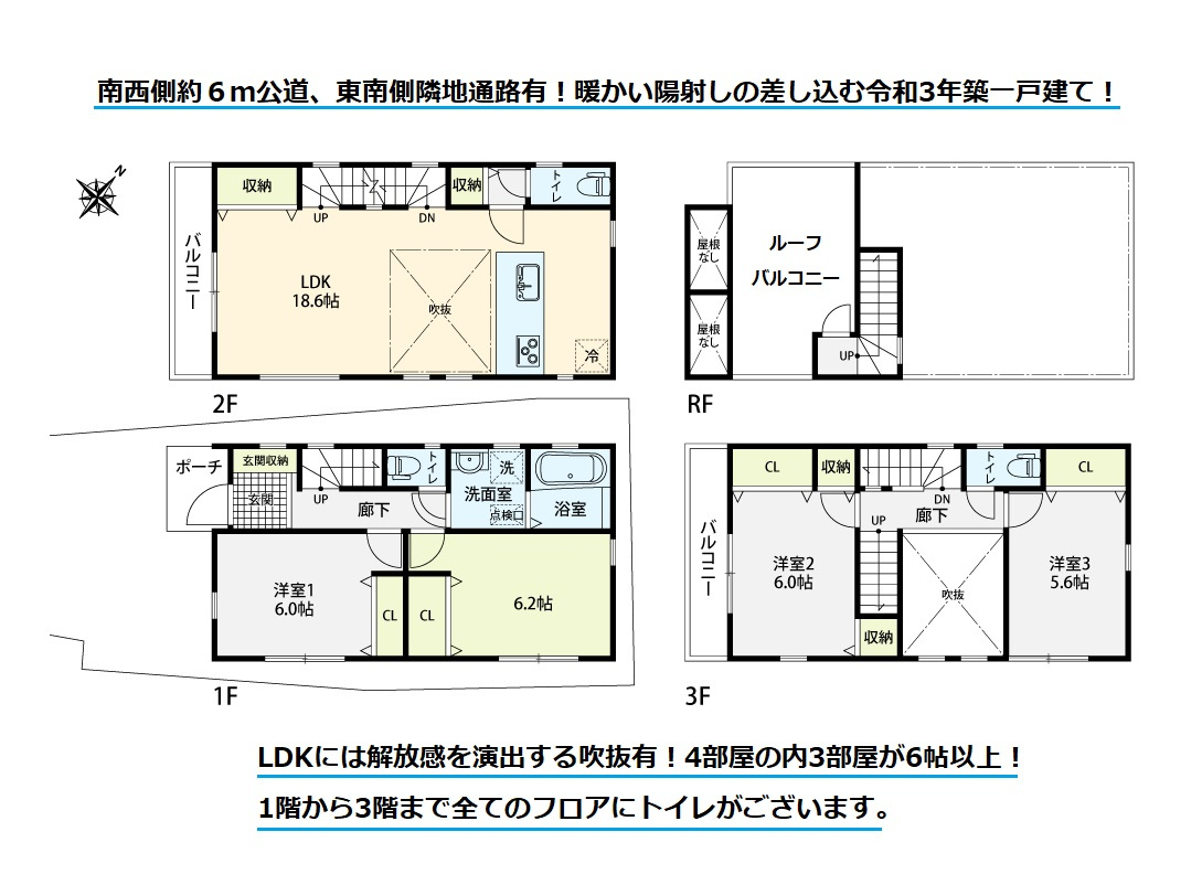 南西側が約6mのスッキリとした公道で、東南側には隣地通路もある為、